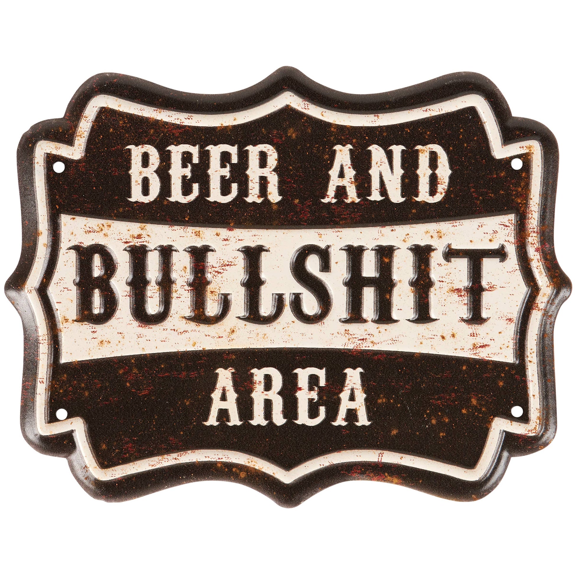 A metal wall décor piece from our Homestead Collection displaying a sign design with a fun farm inspired sentiment that reads "Beer And Bullshit Area." Farm sign design features embossed details and a rust finish for an aged appearance. Our Beer Area metal wall décor is easy to hang against wall using the included mounting hardware and pre-drilled holes in each corner. A rustic farm-themed home accent perfect for everyday display.