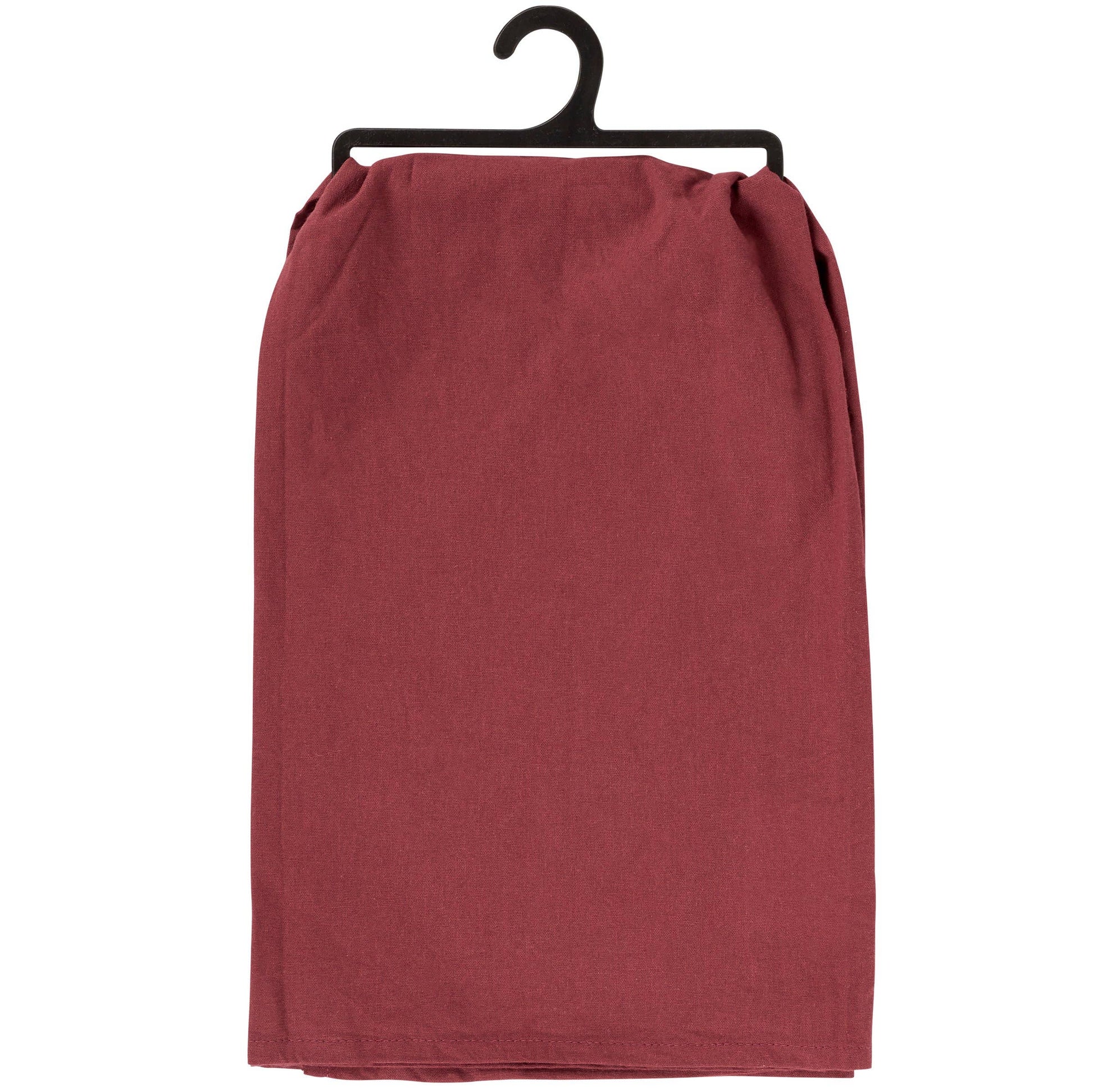 A maroon cotton kitchen towel from our Western Collection displaying a design of a cowboy riding a horse during sunset in a playful hand illustrated style with a fun western-themed sentiment that reads "In Your Buckin' Dreams." Our Buckin' Dreams kitchen towel is conveniently machine-washable for easy cleaning. Western kitchen towel is packaged on a black plastic hanger to easily display on rack. A fun western kitchen accessory perfect for everyday use.