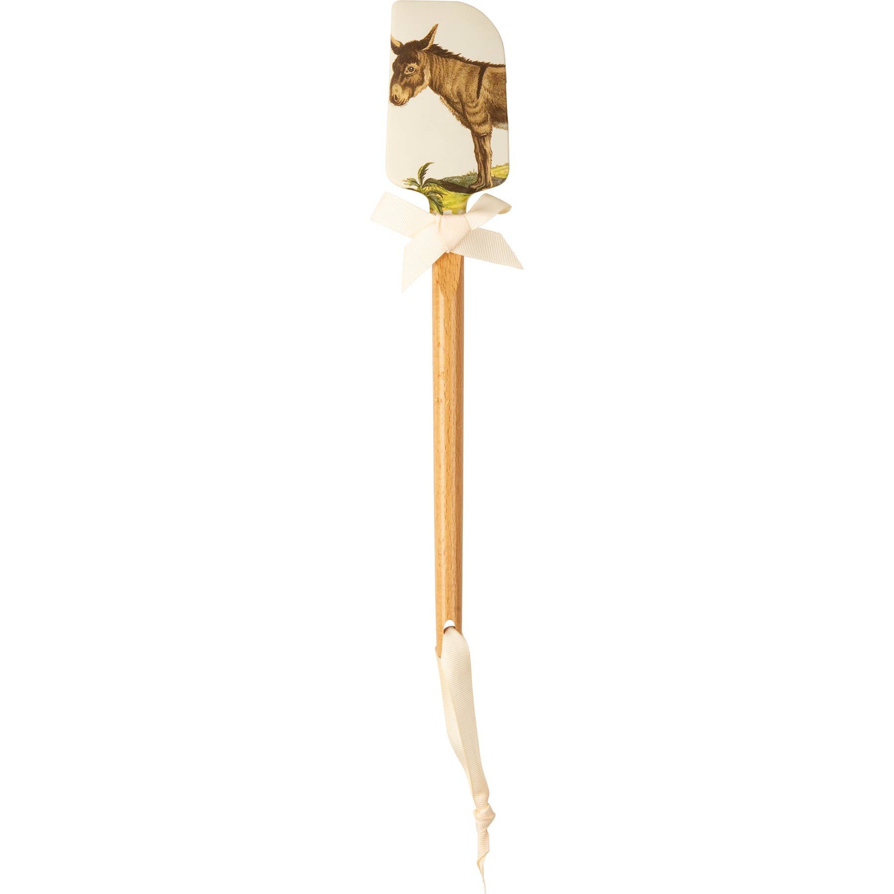 A double-sided silicone spatula featuring a vintage-style donkey design on one side, and punny "Nice Ass" sentiment on the other side. Our Nice Ass spatula features a logo engraved into wooden handle for added interest and includes a decorative bow and ribbon for hanging. Hand wash recommended; not microwave safe.